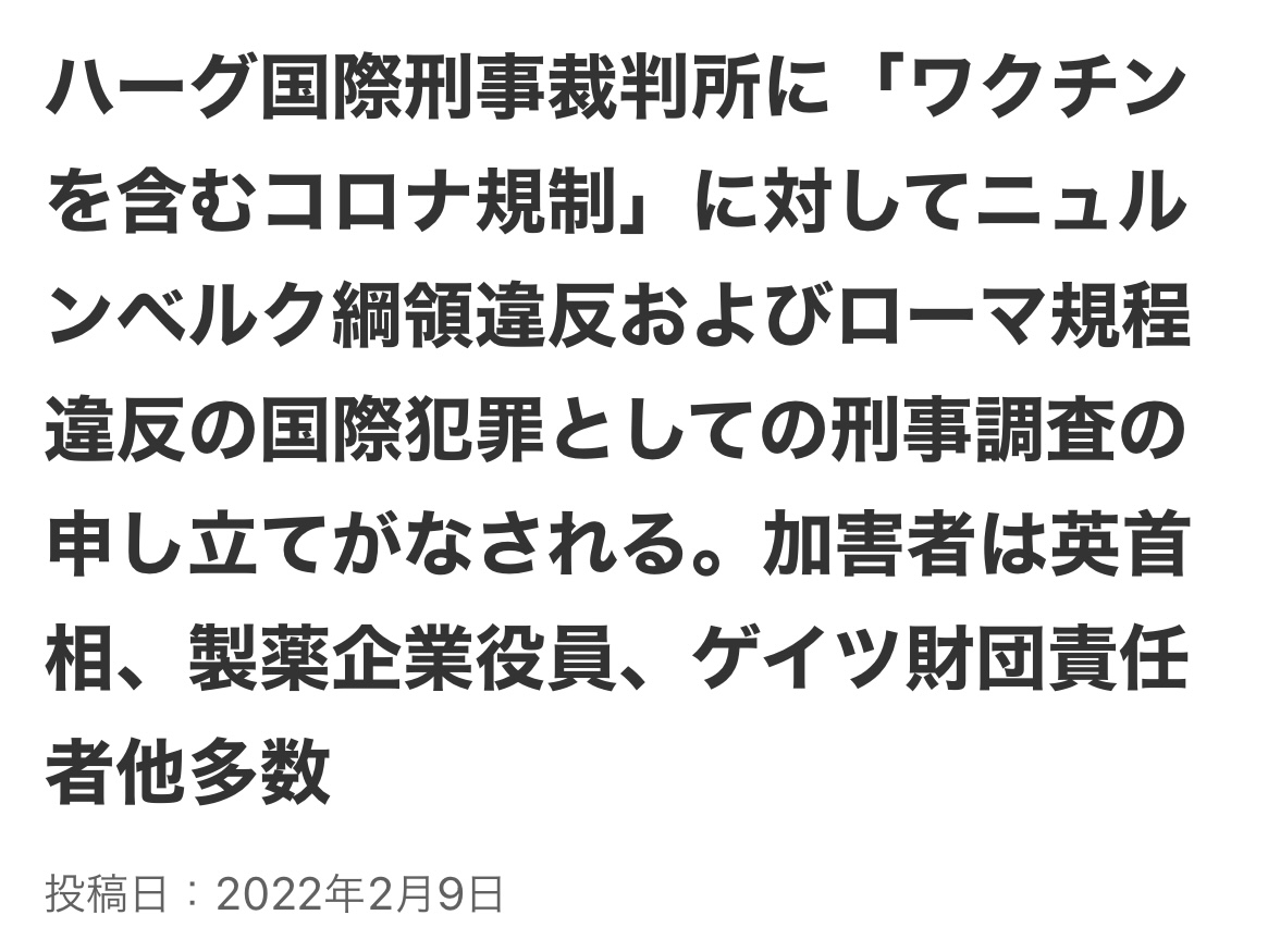 ➡ ハーグ国際刑事裁判所に「ワクチンを含むコロナ規制」に対してニュルンベルク綱領違反およびローマ規程違反の国際犯罪としての刑事調査の申し立てがなされる。加害者は英首相、製薬企業役員、ゲイツ財団責任者他多数