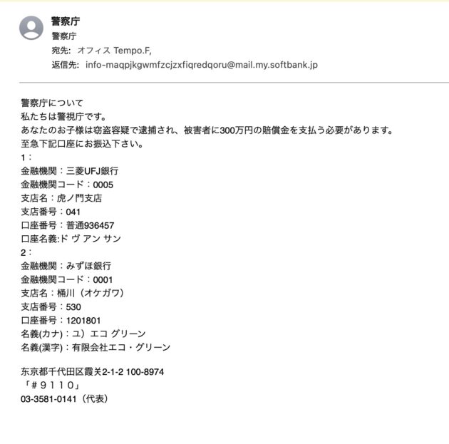 ブログ・NEWS 警察庁からメールが届きました‼️ 2024.02.28 うわ〜‼️ とうとうやっちまった‼️ 陰謀論書きすぎた‼️ 😎 😎 😎 仕事前のルーティーンでメールチェックをしていたら、 なんと、 なんと、 なんとっ‼️ 警察庁からメールが届いていた。 兵庫県警ではなく警察庁‼️ んな、馬鹿な〜〜⁉️ ((((;゚Д゚))))))) 内容は以下です。 うわーーーーー‼️ やばっ‼️ 子供が逮捕されたみたいです‼️ ((((;゚Д゚))))))) どの子供だろう・・・? モモちゃん、タマちゃん、 モイミー、マロリー・・・・・(=^ェ^=) ???????? しかもソフトバンクのメールから届いてる! 口座名義が変だ! ( ^∀^) ( ´ ▽ ` ) ( ´∀`) アホだねぇ。 全く無駄な労力。 日本人じゃないな。 まさかこんなのに騙される人はいないけど 一応、注意勧告。 お氣をつけ下さい(=´∀`) 大塚国際美術館 前の記事 神戸市灘区の怪 次の記事 最近の記事 3月よ、さようなら 地震と大気汚染と春 光陰矢の如し 投稿カテゴリー プロフィール ブログ・NEWS CD・楽譜販売 出版楽譜 オフィス Tempo.F 営業と業務について 演奏会と新刊楽譜出版の告知と発表 音楽エッセイ 音楽家・オススメ音楽 音楽家・オススメ書籍 音楽家・休日の過ごし方 作曲・編曲・制作の軌跡 家庭菜園 健康情報 その他 年月日別 年月日別 アーカイブ 2026年3月 2026年2月 2026年1月 2025年12月 2025年11月 2025年10月 2025年9月 2025年8月 2025年7月 2025年6月 2025年5月 2025年4月 2025年3月 2025年2月 2025年1月 2024年12月 2024年11月 2024年10月 2024年9月 2024年8月 2024年7月 2024年6月 2024年5月 2024年4月 2024年3月 2024年2月 2024年1月 2023年12月 2023年11月 2023年10月 2023年9月 2023年8月 2023年7月 2023年6月 2023年5月 2023年4月 2023年3月 2023年2月 2023年1月 2022年12月 2022年11月 2022年10月 2022年9月 2022年8月 2022年7月 2022年6月 2022年5月 2022年4月 2022年3月 2022年2月 2022年1月 2021年12月 2021年11月 2021年10月 2021年9月 2021年8月 2021年7月 2021年6月 2021年5月 2021年4月 2021年3月 2021年2月 2021年1月 2020年12月 2020年11月 2020年10月 2020年9月 2020年8月 2020年7月 2020年6月 2020年5月 2020年4月 2020年3月 2020年2月 2020年1月 2019年12月 2019年11月 2019年10月 2019年9月 2019年8月 2019年7月 2019年6月 2019年5月 2019年4月 2019年3月 2019年2月 2019年1月 2018年12月 2018年11月 2018年10月 2018年9月 2018年8月 2018年7月 2018年6月 2018年5月 2018年4月 2018年3月 2018年2月 2018年1月 2017年12月 2017年11月 2017年10月 2017年9月 2017年8月 2017年7月 2017年6月 2017年5月 2017年4月 2017年3月 2017年2月 2017年1月 2016年12月 2016年11月 2016年10月 2016年9月 2016年8月 2016年7月 2016年6月 2016年5月 2016年4月 2016年3月 2016年2月 2016年1月 2015年12月 2015年11月 2015年10月 2015年9月 2015年8月 2015年7月 2015年6月 2015年5月 2015年4月 2015年3月 2015年2月 検索:
