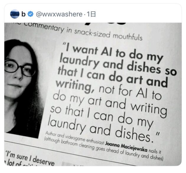 ブログ・NEWS AIへの希望 2025.12.03 今年はAI利用が一般に広がりましたね。 みんなChantGPT使ってるもんなぁ・・・。 (私も含め) ツイッターで見つけたつぶやき。 これが本質だわ‼️ “I want Al to do my laundry and dishes so that I can do art and writing, not for Al to do my art and writing so that I can do my laundry and dishes. >洗濯とか皿洗いを AIにやってもらうことで、 自分がアートや執筆に 専念したいんです。 アートや執筆を AIにやってもらうことで 自分が洗濯や皿洗いに 専念したいんじゃないんです。 これなんです! マジで。 でも現状って逆だよね。 ┐(´д`)┌ヤレヤレ クリエイティブなことは人間に任せろ。 血の通った作品。 魂の音。 (о´∀`о) 【ご連絡】楽譜販売を再開しました 前の記事 風邪には気をつけて 次の記事 最近の記事 3月よ、さようなら 地震と大気汚染と春 光陰矢の如し 投稿カテゴリー プロフィール ブログ・NEWS CD・楽譜販売 出版楽譜 オフィス Tempo.F 営業と業務について 演奏会と新刊楽譜出版の告知と発表 音楽エッセイ 音楽家・オススメ音楽 音楽家・オススメ書籍 音楽家・休日の過ごし方 作曲・編曲・制作の軌跡 家庭菜園 健康情報 その他 年月日別 年月日別 アーカイブ 2026年3月 2026年2月 2026年1月 2025年12月 2025年11月 2025年10月 2025年9月 2025年8月 2025年7月 2025年6月 2025年5月 2025年4月 2025年3月 2025年2月 2025年1月 2024年12月 2024年11月 2024年10月 2024年9月 2024年8月 2024年7月 2024年6月 2024年5月 2024年4月 2024年3月 2024年2月 2024年1月 2023年12月 2023年11月 2023年10月 2023年9月 2023年8月 2023年7月 2023年6月 2023年5月 2023年4月 2023年3月 2023年2月 2023年1月 2022年12月 2022年11月 2022年10月 2022年9月 2022年8月 2022年7月 2022年6月 2022年5月 2022年4月 2022年3月 2022年2月 2022年1月 2021年12月 2021年11月 2021年10月 2021年9月 2021年8月 2021年7月 2021年6月 2021年5月 2021年4月 2021年3月 2021年2月 2021年1月 2020年12月 2020年11月 2020年10月 2020年9月 2020年8月 2020年7月 2020年6月 2020年5月 2020年4月 2020年3月 2020年2月 2020年1月 2019年12月 2019年11月 2019年10月 2019年9月 2019年8月 2019年7月 2019年6月 2019年5月 2019年4月 2019年3月 2019年2月 2019年1月 2018年12月 2018年11月 2018年10月 2018年9月 2018年8月 2018年7月 2018年6月 2018年5月 2018年4月 2018年3月 2018年2月 2018年1月 2017年12月 2017年11月 2017年10月 2017年9月 2017年8月 2017年7月 2017年6月 2017年5月 2017年4月 2017年3月 2017年2月 2017年1月 2016年12月 2016年11月 2016年10月 2016年9月 2016年8月 2016年7月 2016年6月 2016年5月 2016年4月 2016年3月 2016年2月 2016年1月 2015年12月 2015年11月 2015年10月 2015年9月 2015年8月 2015年7月 2015年6月 2015年5月 2015年4月 2015年3月 2015年2月 検索: