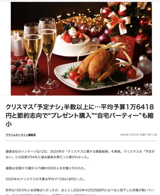➡ クリスマス「予定ナシ」半数以上に…平均予算1万6418円と節約志向で“プレゼント購入”“自宅パーティー”も縮小