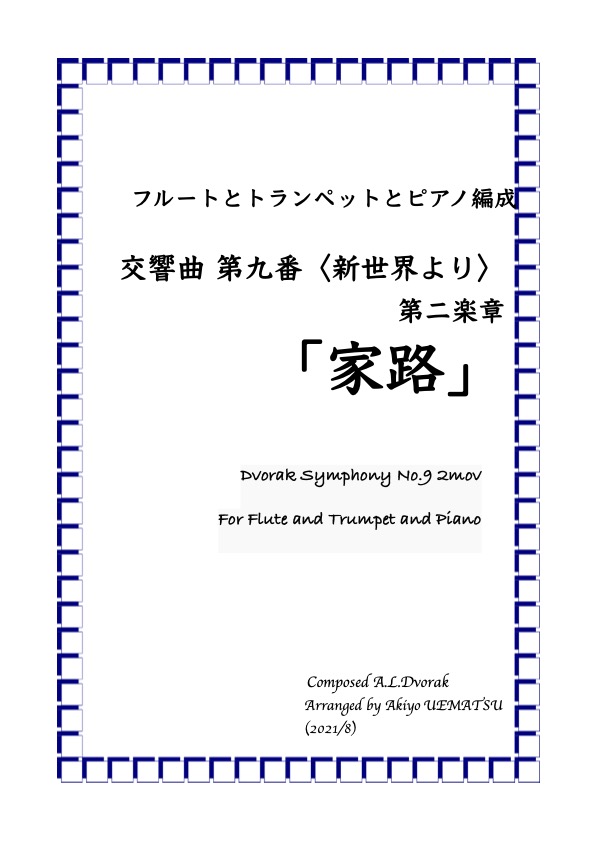 出版楽譜 ブログ・NEWS CD・楽譜販売 【楽譜】フルートとトランペットとピアノ編成『家路』交響曲第九番〈新世界より〉第二楽章 2021.12.13 楽譜販売 曲 名 交響曲第九番〈新世界より〉第二楽章 『家路』 楽器編成 フルートとトランペットとピアノ 価 格 1800円 音源 YouTube 販売店 ・オフィス Tempo.Fオンラインショップ ・村松楽器販売 曲解説 この楽譜はチェコの作曲家である、アントニン・ドヴォルザークが1893年に作曲した交響曲 第九番〈新世界より〉の第二楽章「ラルゴ」をフルートとトランペット、ピアノ編成に編曲したものである。日本ではこのメロディーを元に、作詞家の堀内敬三が日本語の歌詞をつけ『遠き山に日は落ちて』というタイトルで親しまれている。 《演奏と楽譜のポイント》 ・両パートに旋律が吹けるようにアレンジしています。トランペットの代わりにコルネットを用いてもフルートとよく馴染みます。 ・参考演奏はYouTubeにて公開中です。また紛失防止のため、パート譜は別紙ではなくスコアと共に綴じています。 演奏レベル:中級者 演奏時間:約4分 リモート飲み会♫/お知らせ♫ 前の記事 良いお年を❣️ 次の記事 最近の記事 膝、その後とアラフィフ障害 【重要】ナフサ!物流大丈夫?? オフィス Tempo.F GW休業のお知らせ 投稿カテゴリー プロフィール ブログ・NEWS CD・楽譜販売 出版楽譜 オフィス Tempo.F 営業と業務について 演奏会と新刊楽譜出版の告知と発表 音楽エッセイ 音楽家・オススメ音楽 音楽家・オススメ書籍 音楽家・休日の過ごし方 作曲・編曲・制作の軌跡 家庭菜園 健康情報 その他 年月日別 年月日別 アーカイブ 2026年4月 2026年3月 2026年2月 2026年1月 2025年12月 2025年11月 2025年10月 2025年9月 2025年8月 2025年7月 2025年6月 2025年5月 2025年4月 2025年3月 2025年2月 2025年1月 2024年12月 2024年11月 2024年10月 2024年9月 2024年8月 2024年7月 2024年6月 2024年5月 2024年4月 2024年3月 2024年2月 2024年1月 2023年12月 2023年11月 2023年10月 2023年9月 2023年8月 2023年7月 2023年6月 2023年5月 2023年4月 2023年3月 2023年2月 2023年1月 2022年12月 2022年11月 2022年10月 2022年9月 2022年8月 2022年7月 2022年6月 2022年5月 2022年4月 2022年3月 2022年2月 2022年1月 2021年12月 2021年11月 2021年10月 2021年9月 2021年8月 2021年7月 2021年6月 2021年5月 2021年4月 2021年3月 2021年2月 2021年1月 2020年12月 2020年11月 2020年10月 2020年9月 2020年8月 2020年7月 2020年6月 2020年5月 2020年4月 2020年3月 2020年2月 2020年1月 2019年12月 2019年11月 2019年10月 2019年9月 2019年8月 2019年7月 2019年6月 2019年5月 2019年4月 2019年3月 2019年2月 2019年1月 2018年12月 2018年11月 2018年10月 2018年9月 2018年8月 2018年7月 2018年6月 2018年5月 2018年4月 2018年3月 2018年2月 2018年1月 2017年12月 2017年11月 2017年10月 2017年9月 2017年8月 2017年7月 2017年6月 2017年5月 2017年4月 2017年3月 2017年2月 2017年1月 2016年12月 2016年11月 2016年10月 2016年9月 2016年8月 2016年7月 2016年6月 2016年5月 2016年4月 2016年3月 2016年2月 2016年1月 2015年12月 2015年11月 2015年10月 2015年9月 2015年8月 2015年7月 2015年6月 2015年5月 2015年4月 2015年3月 2015年2月 検索: