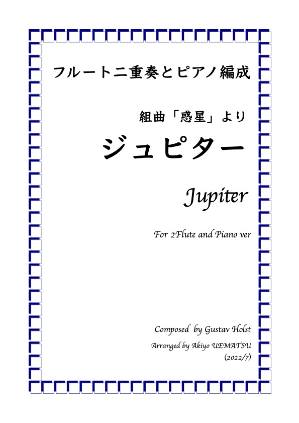 出版楽譜 ブログ・NEWS CD・楽譜販売 演奏会と新刊楽譜出版の告知と発表 【楽譜】2本のフルートとピアノ編成『ジュピター』 2022.12.02 *追記:ムラマツフルート様でも購入できるようになりました。 楽譜販売 曲 名 組曲「惑星」より ジュピター 楽器編成 フルート二重奏とピアノ編成 価 格 ダウンロード楽譜 1500円 製本楽譜 1800円 音源 YouTube 販売店 ・オフィス Tempo.Fオンラインショップ ・ダウンロード楽譜 ・村松楽器販売 曲解説 演奏レベル:上初級〜中級 演奏時間:約4分 《演奏のポイント》 一般的にも有名で人気のある曲ですので、 コンサートやイベントなどで演奏すると 楽しんで頂けるナンバーです。 2本のフルートのハーモニーが美しく響くよう編曲しました。 《留意点》 この楽譜は、紛失防止のため、 パート譜は別紙ではなく スコアと共に綴じています。 《参考演奏》(YouTube) この動画のピアノは電子音です。演奏に多少のズレがありますがご了承下さい。 本来、地球は美しい 前の記事 【健康情報11】オーガニックビールとクラフトビール 次の記事 最近の記事 4月よ、こんにちは!/家庭菜園メニュー 3月よ、さようなら 地震と大気汚染と春 投稿カテゴリー プロフィール ブログ・NEWS CD・楽譜販売 出版楽譜 オフィス Tempo.F 営業と業務について 演奏会と新刊楽譜出版の告知と発表 音楽エッセイ 音楽家・オススメ音楽 音楽家・オススメ書籍 音楽家・休日の過ごし方 作曲・編曲・制作の軌跡 家庭菜園 健康情報 その他 年月日別 年月日別 アーカイブ 2026年4月 2026年3月 2026年2月 2026年1月 2025年12月 2025年11月 2025年10月 2025年9月 2025年8月 2025年7月 2025年6月 2025年5月 2025年4月 2025年3月 2025年2月 2025年1月 2024年12月 2024年11月 2024年10月 2024年9月 2024年8月 2024年7月 2024年6月 2024年5月 2024年4月 2024年3月 2024年2月 2024年1月 2023年12月 2023年11月 2023年10月 2023年9月 2023年8月 2023年7月 2023年6月 2023年5月 2023年4月 2023年3月 2023年2月 2023年1月 2022年12月 2022年11月 2022年10月 2022年9月 2022年8月 2022年7月 2022年6月 2022年5月 2022年4月 2022年3月 2022年2月 2022年1月 2021年12月 2021年11月 2021年10月 2021年9月 2021年8月 2021年7月 2021年6月 2021年5月 2021年4月 2021年3月 2021年2月 2021年1月 2020年12月 2020年11月 2020年10月 2020年9月 2020年8月 2020年7月 2020年6月 2020年5月 2020年4月 2020年3月 2020年2月 2020年1月 2019年12月 2019年11月 2019年10月 2019年9月 2019年8月 2019年7月 2019年6月 2019年5月 2019年4月 2019年3月 2019年2月 2019年1月 2018年12月 2018年11月 2018年10月 2018年9月 2018年8月 2018年7月 2018年6月 2018年5月 2018年4月 2018年3月 2018年2月 2018年1月 2017年12月 2017年11月 2017年10月 2017年9月 2017年8月 2017年7月 2017年6月 2017年5月 2017年4月 2017年3月 2017年2月 2017年1月 2016年12月 2016年11月 2016年10月 2016年9月 2016年8月 2016年7月 2016年6月 2016年5月 2016年4月 2016年3月 2016年2月 2016年1月 2015年12月 2015年11月 2015年10月 2015年9月 2015年8月 2015年7月 2015年6月 2015年5月 2015年4月 2015年3月 2015年2月 検索:
