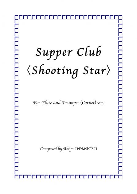 出版楽譜 ブログ・NEWS CD・楽譜販売 【楽譜】フルートとトランペットとピアノ編成『supper club 「shooting star」』上松明代 オリジナル曲 2017.07.13 楽譜販売(デジタル楽譜) 曲 名 supper club 「shooting star」ジプシージャズテイスト 楽器編成 フルート/トランペット(コルネット)/ピアノ 価 格 2000円(税込) 音 源 YouTube 販売店 BASE (デジタル楽譜) 曲解説 【ご注意ください】 この楽譜はパーカッションタブは書かれていません。 パーカッションなしでも、充分ジャズ感が出るようオーケストレーションされています。 邦題「狙い撃ち」 〜曲イメージ〜 軽く食事の出来る雰囲気のいいサパークラブ「shooting star」で、薄暗い照明の中バンドが演奏している曲を、 お酒を飲みながら聴いているという風景をイメージした曲。 クラシック音楽調の曲ではなく、ジプシージャズテイストの曲ですので、楽譜に記されないリズム感(スイング)などが楽しい曲です。YouTubeの演奏を参考の上、演奏下さい。ライブでめちゃくちゃ盛り上がります!!! *参考演奏はコルネットを使用しています。 ライブでめちゃくちゃ盛り上がります!!! 演奏時間:約4分 フォローするとお得な特典がいっぱい! 詳細はこちら☞https://akiyouematsu.com/blog/6952/ 梅雨明け 前の記事 初・レコーディング フルートデュオ 次の記事 最近の記事 膝、その後とアラフィフ障害 【重要】ナフサ!物流大丈夫?? オフィス Tempo.F GW休業のお知らせ 投稿カテゴリー プロフィール ブログ・NEWS CD・楽譜販売 出版楽譜 オフィス Tempo.F 営業と業務について 演奏会と新刊楽譜出版の告知と発表 音楽エッセイ 音楽家・オススメ音楽 音楽家・オススメ書籍 音楽家・休日の過ごし方 作曲・編曲・制作の軌跡 家庭菜園 健康情報 その他 年月日別 年月日別 アーカイブ 2026年4月 2026年3月 2026年2月 2026年1月 2025年12月 2025年11月 2025年10月 2025年9月 2025年8月 2025年7月 2025年6月 2025年5月 2025年4月 2025年3月 2025年2月 2025年1月 2024年12月 2024年11月 2024年10月 2024年9月 2024年8月 2024年7月 2024年6月 2024年5月 2024年4月 2024年3月 2024年2月 2024年1月 2023年12月 2023年11月 2023年10月 2023年9月 2023年8月 2023年7月 2023年6月 2023年5月 2023年4月 2023年3月 2023年2月 2023年1月 2022年12月 2022年11月 2022年10月 2022年9月 2022年8月 2022年7月 2022年6月 2022年5月 2022年4月 2022年3月 2022年2月 2022年1月 2021年12月 2021年11月 2021年10月 2021年9月 2021年8月 2021年7月 2021年6月 2021年5月 2021年4月 2021年3月 2021年2月 2021年1月 2020年12月 2020年11月 2020年10月 2020年9月 2020年8月 2020年7月 2020年6月 2020年5月 2020年4月 2020年3月 2020年2月 2020年1月 2019年12月 2019年11月 2019年10月 2019年9月 2019年8月 2019年7月 2019年6月 2019年5月 2019年4月 2019年3月 2019年2月 2019年1月 2018年12月 2018年11月 2018年10月 2018年9月 2018年8月 2018年7月 2018年6月 2018年5月 2018年4月 2018年3月 2018年2月 2018年1月 2017年12月 2017年11月 2017年10月 2017年9月 2017年8月 2017年7月 2017年6月 2017年5月 2017年4月 2017年3月 2017年2月 2017年1月 2016年12月 2016年11月 2016年10月 2016年9月 2016年8月 2016年7月 2016年6月 2016年5月 2016年4月 2016年3月 2016年2月 2016年1月 2015年12月 2015年11月 2015年10月 2015年9月 2015年8月 2015年7月 2015年6月 2015年5月 2015年4月 2015年3月 2015年2月 検索: