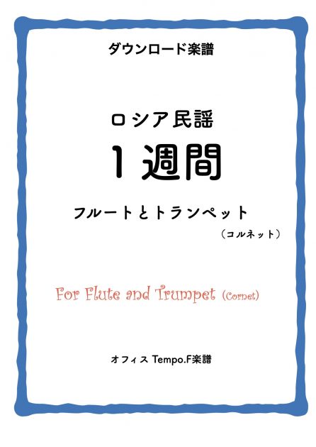 出版楽譜 CD・楽譜販売 【楽譜】ロシア民謡『1週間』フルートとトランペット楽譜 2020.07.28 楽譜販売 曲 名 ロシア民謡「1週間」 楽器編成 ・フルートとトランペット 価 格 380円 音源 YouTube 販売店 Piascore ダウンロード楽譜 曲解説 ・一度は聞いたことがあるはず。この歌です ♫〜日曜日に 市場(いちば)へでかけ 糸と麻(あさ)を 買ってきた テュリャ テュリャ テュリャ テュリャ テュリャ テュリャリャ テュリャ テュリャ テュリャ テュリャ リャ〜 ・トランペットをコルネットに用いてもフルートと相性良しです。 ・中間部にオリジナルにはないエピソードを書いています。その故、演奏レベルが少し上がっています。 ・聴き映えする派手めはアレンジを施していますので、アンコールやオープニング曲に最適です! 演奏レベル:上中級以上 演奏時間:約4分 編曲:上松明代(2020/7) オフィス Tempo.Fダウンロード楽譜 【楽譜】天空の城ラピュタより『君をのせて』フルートとトランペット/フルートデュオ楽譜 前の記事 久しぶりの演奏会!! 次の記事 最近の記事 膝、その後とアラフィフ障害 【重要】ナフサ!物流大丈夫?? オフィス Tempo.F GW休業のお知らせ 投稿カテゴリー プロフィール ブログ・NEWS CD・楽譜販売 出版楽譜 オフィス Tempo.F 営業と業務について 演奏会と新刊楽譜出版の告知と発表 音楽エッセイ 音楽家・オススメ音楽 音楽家・オススメ書籍 音楽家・休日の過ごし方 作曲・編曲・制作の軌跡 家庭菜園 健康情報 その他 年月日別 年月日別 アーカイブ 2026年4月 2026年3月 2026年2月 2026年1月 2025年12月 2025年11月 2025年10月 2025年9月 2025年8月 2025年7月 2025年6月 2025年5月 2025年4月 2025年3月 2025年2月 2025年1月 2024年12月 2024年11月 2024年10月 2024年9月 2024年8月 2024年7月 2024年6月 2024年5月 2024年4月 2024年3月 2024年2月 2024年1月 2023年12月 2023年11月 2023年10月 2023年9月 2023年8月 2023年7月 2023年6月 2023年5月 2023年4月 2023年3月 2023年2月 2023年1月 2022年12月 2022年11月 2022年10月 2022年9月 2022年8月 2022年7月 2022年6月 2022年5月 2022年4月 2022年3月 2022年2月 2022年1月 2021年12月 2021年11月 2021年10月 2021年9月 2021年8月 2021年7月 2021年6月 2021年5月 2021年4月 2021年3月 2021年2月 2021年1月 2020年12月 2020年11月 2020年10月 2020年9月 2020年8月 2020年7月 2020年6月 2020年5月 2020年4月 2020年3月 2020年2月 2020年1月 2019年12月 2019年11月 2019年10月 2019年9月 2019年8月 2019年7月 2019年6月 2019年5月 2019年4月 2019年3月 2019年2月 2019年1月 2018年12月 2018年11月 2018年10月 2018年9月 2018年8月 2018年7月 2018年6月 2018年5月 2018年4月 2018年3月 2018年2月 2018年1月 2017年12月 2017年11月 2017年10月 2017年9月 2017年8月 2017年7月 2017年6月 2017年5月 2017年4月 2017年3月 2017年2月 2017年1月 2016年12月 2016年11月 2016年10月 2016年9月 2016年8月 2016年7月 2016年6月 2016年5月 2016年4月 2016年3月 2016年2月 2016年1月 2015年12月 2015年11月 2015年10月 2015年9月 2015年8月 2015年7月 2015年6月 2015年5月 2015年4月 2015年3月 2015年2月 検索: